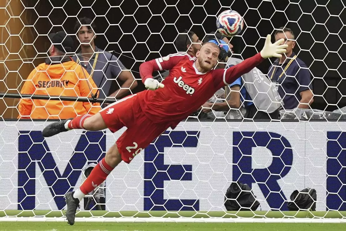 Juventus' Michele Di Gregorio savesduring the Club World Cup round of 16 soccer match between Real Madrid and Juventus in Miami Gardens, Fla., Tuesday, July 1, 2025. (AP Photo/Rebecca Blackwell)