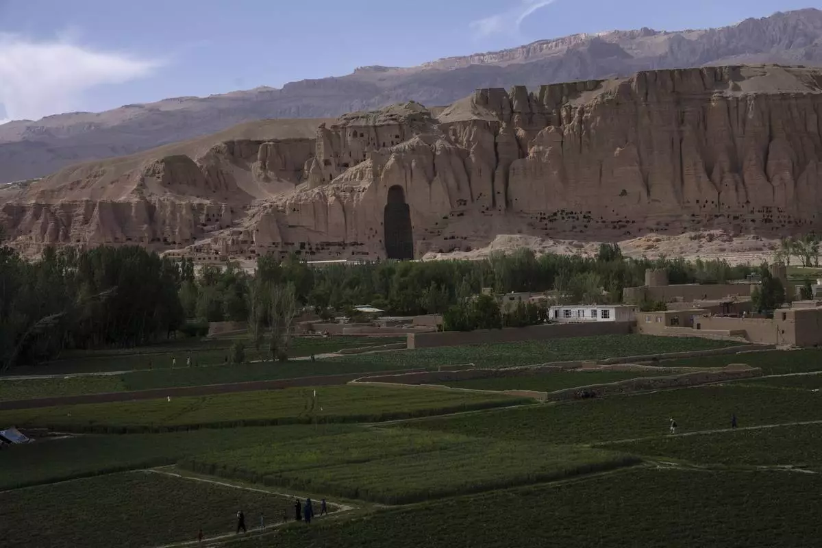 FILE.- Villagers walk in the fields near the niche of the giant Buddha statue destroyed by the Taliban in 2001, in Bamiyan, Afghanistan, Saturday, June 17, 2023. (AP Photo/Rodrigo Abd,File