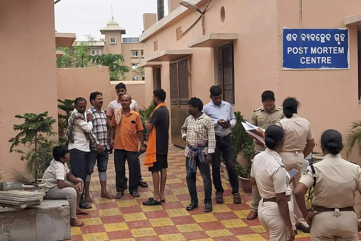 Police personnel and relatives of victims who lost their lives in a crowd surge at a Hindu religious procession wait outside a postmortem center at a government hospital in Puri, India, Sunday, June 29, 2025. (AP Photo)