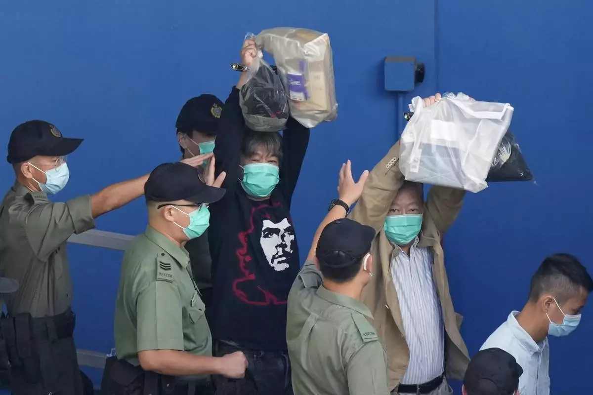 FILE - Pro-democracy activists Leung Kwok-hung, known as "Long Hair," left, and Lee Cheuk-yan raise their hands as they are escorted by Correctional Services officers to a prison van for a court in Hong Kong, on May 28, 2021. (AP Photo/Kin Cheung, File)