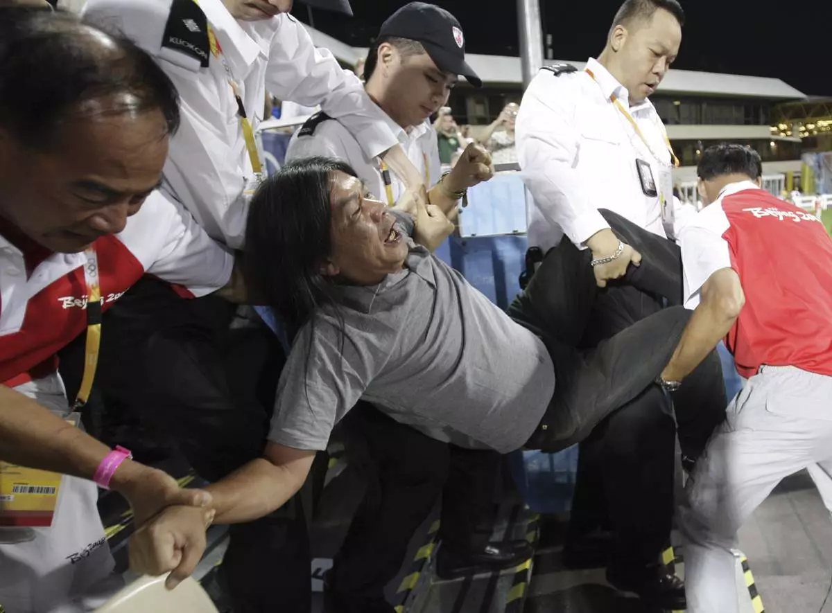 FILE - Security guards force to take away Pro-democracy protesters, Hong Kong legislator Leung Kwok-hung, also known as nickname "Long Hair", on the spectator stand during the first day of Beijing Olympics Equestrian game in Hong Kong on Aug. 9, 2008 while demanding for human rights and to stop one party ruling in China. (AP Photo/Kin Cheung, File)