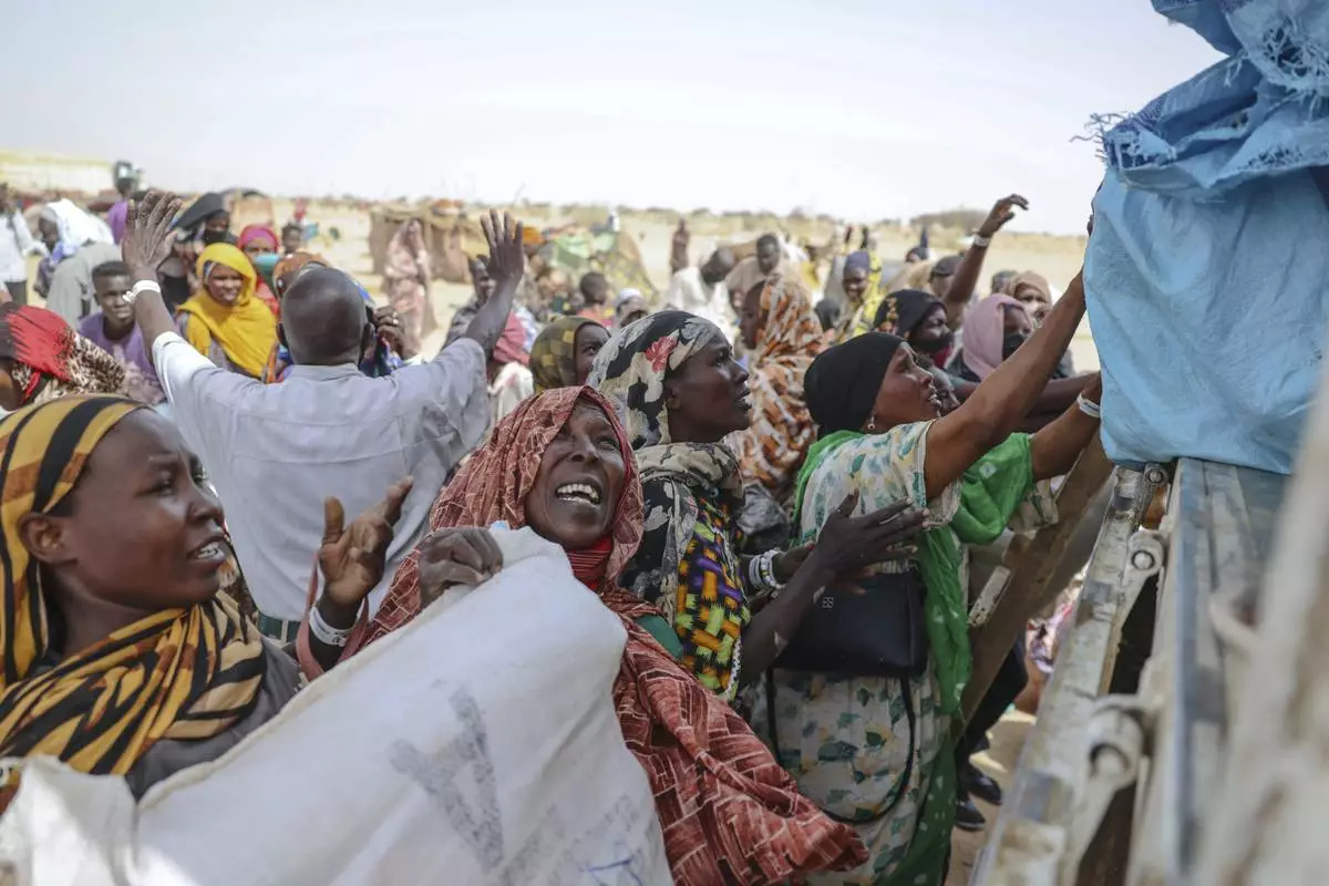 Refugees queue for food distribution in the Adre, Chad, transit camp, Thursday, May 8, 2025. (AP Photo/Caitlin Kelly)