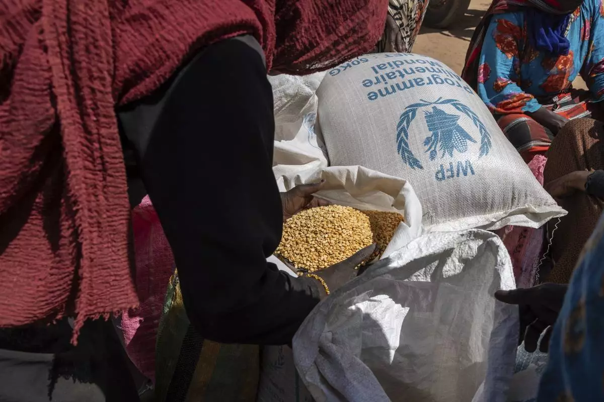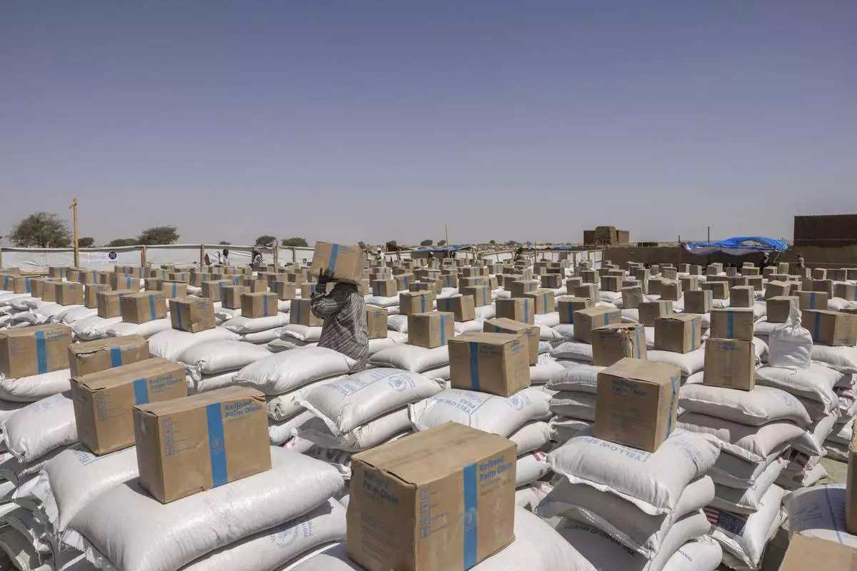 World Food Program supplies wait for distribution in Adre, Chad, Thursday, May 8, 2025. (AP Photo/Caitlin Kelly)