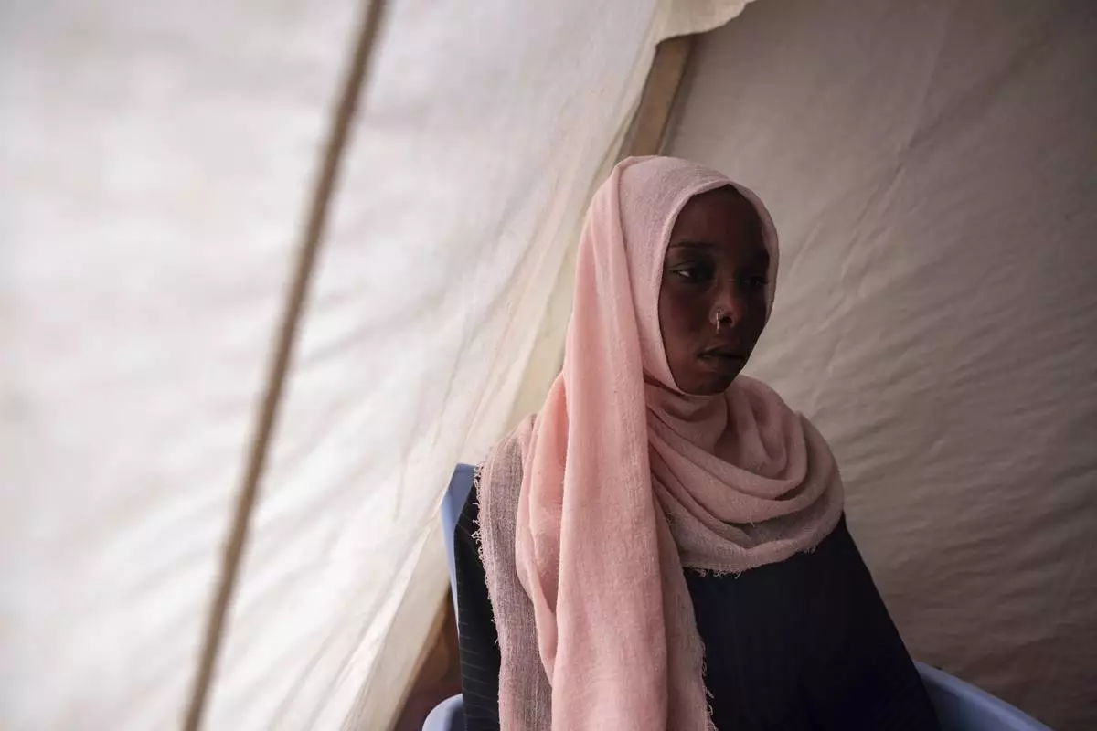 Zohal Abdullah Hamad, who was shot when gunfire broke out, poses for a photograph in Adre, Chad, Tuesday, May 6, 2025. (AP Photo/Caitlin Kelly)