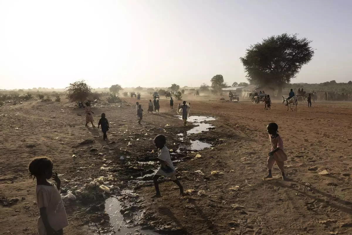 Sudanese children play by the Sudanese border in the Adre, Chad, transit camp, Wednesday , May 7, 2025. (AP Photo/Caitlin Kelly)
