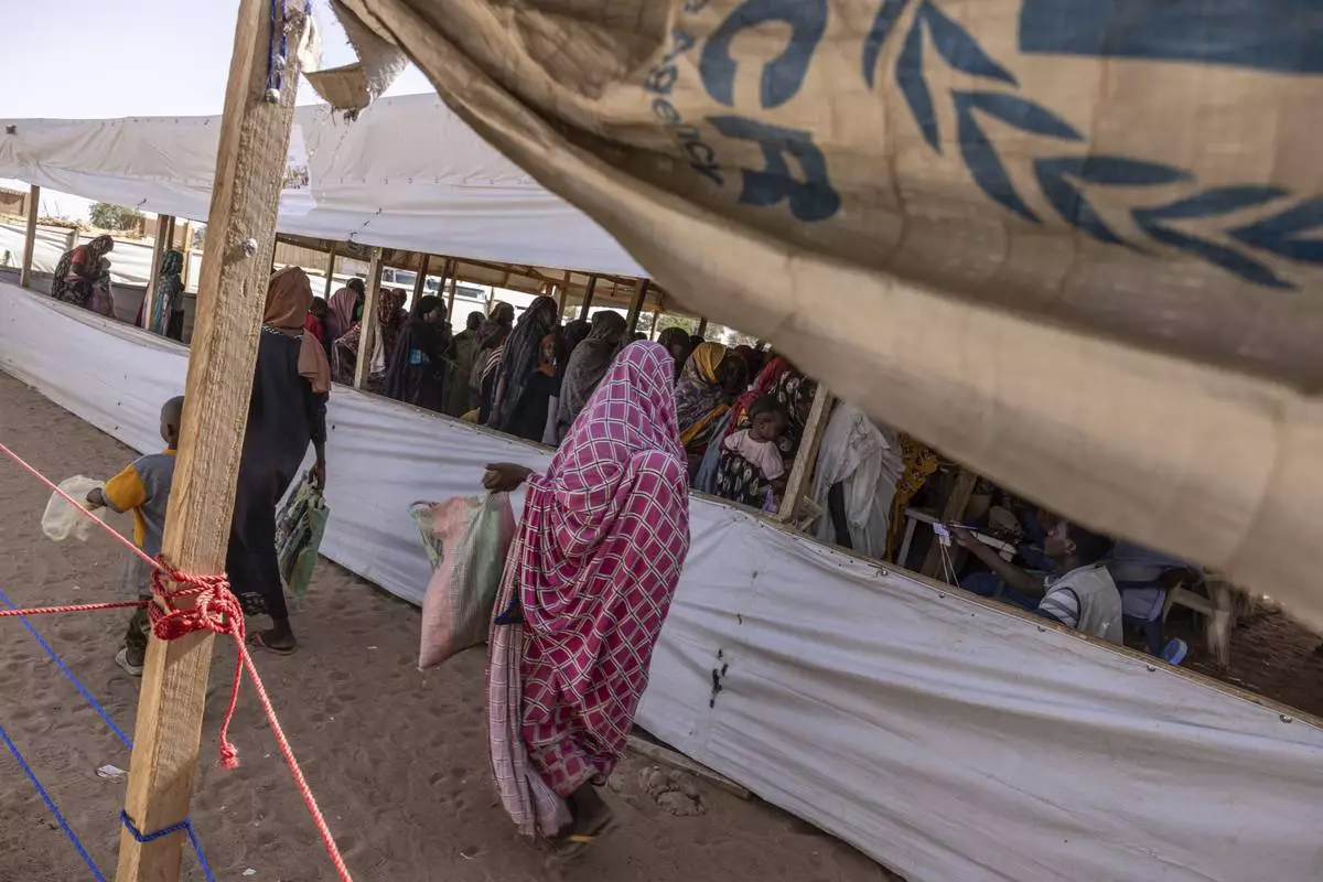 Refugees wait for food distribution at the Tine transit camp in Chad's Wadi Fara province Saturday, May 3, 2025. (AP Photo/Caitlin Kelly)