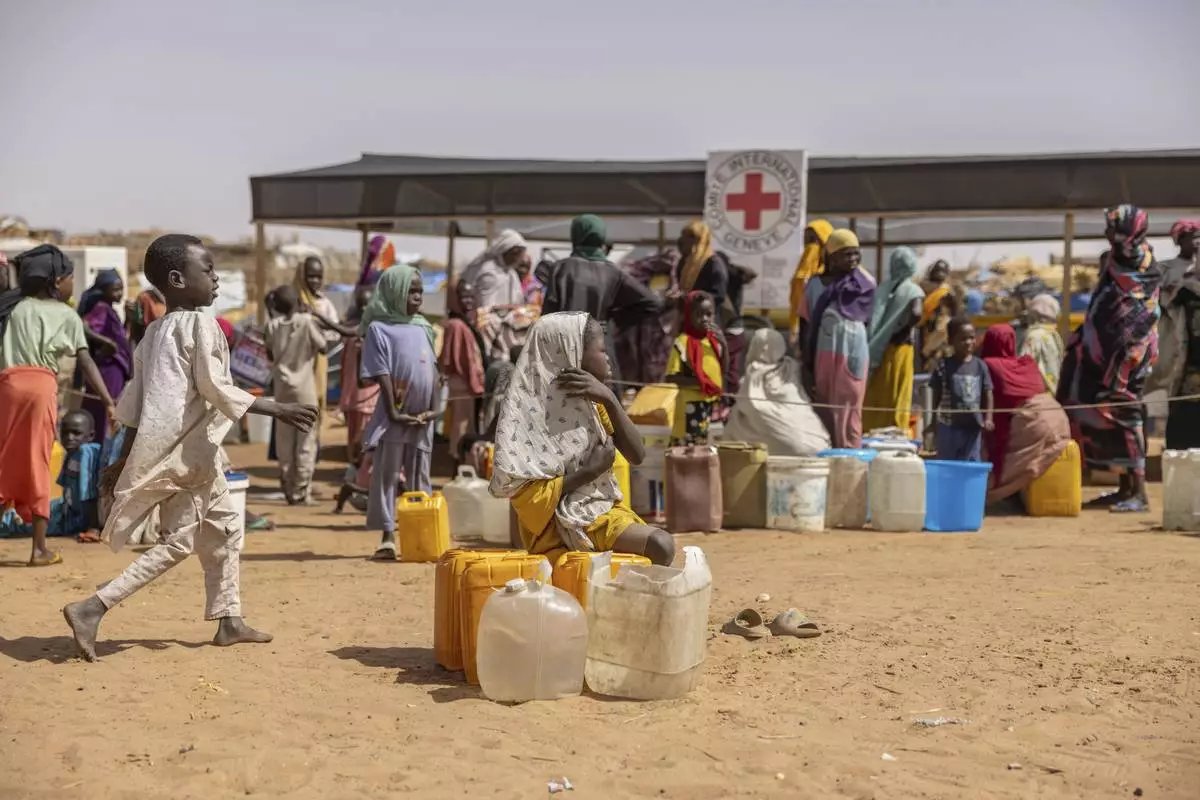 Refugees queue at a Red Cross water point in the Adre, Chad, transit camp, Tuesday, May 6, 2025. (AP Photo/Caitlin Kelly)