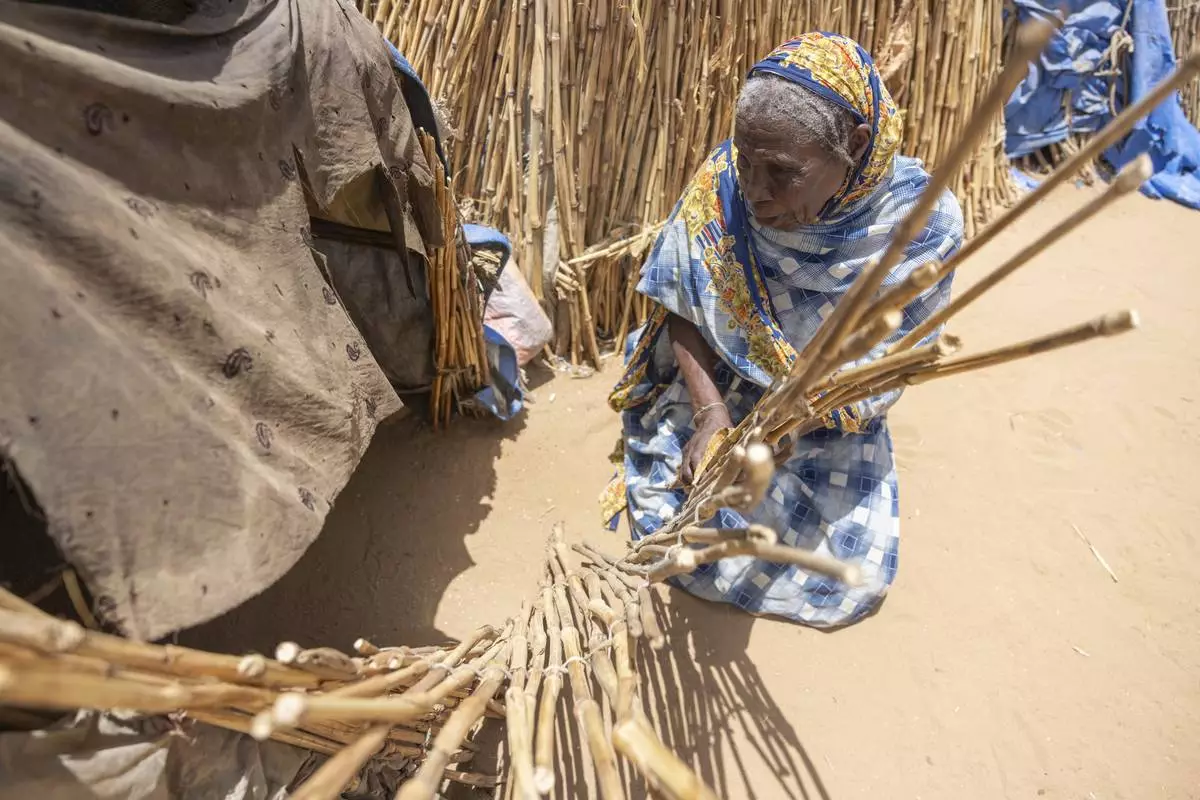 Fatima Omas Abdullah sits by her makeshift shelter in the Adre, Chad, transit camp, Friday, May 9, 2025. (AP Photo/Caitlin Kelly)