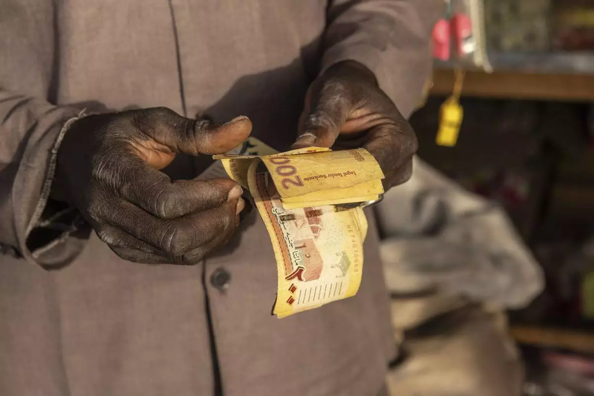 Refugees barter and sell goods using Sudanese pounds in the Adre, Chad, transit camp, Tuesday, May 6, 2025. (AP Photo/Caitlin Kelly)