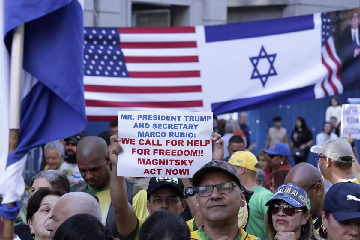 Supporters of former President Jair Bolsonaro protest his Supreme Court trial, in which he is accused of involvement in a 2022 coup attempt, in front of an American and an Israeli flag, in Sao Paulo, Sunday, June, 29, 2025. (AP Photo/Ettore Chiereguini)