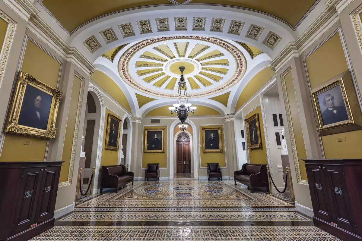 The ornate corridor outside the Senate chamber is seen as Senate Republicans work to pass President Donald Trump's bill of tax breaks and spending cuts by his July Fourth deadline, in Washington, Sunday, June 29, 2025. (AP Photo/J. Scott Applewhite)