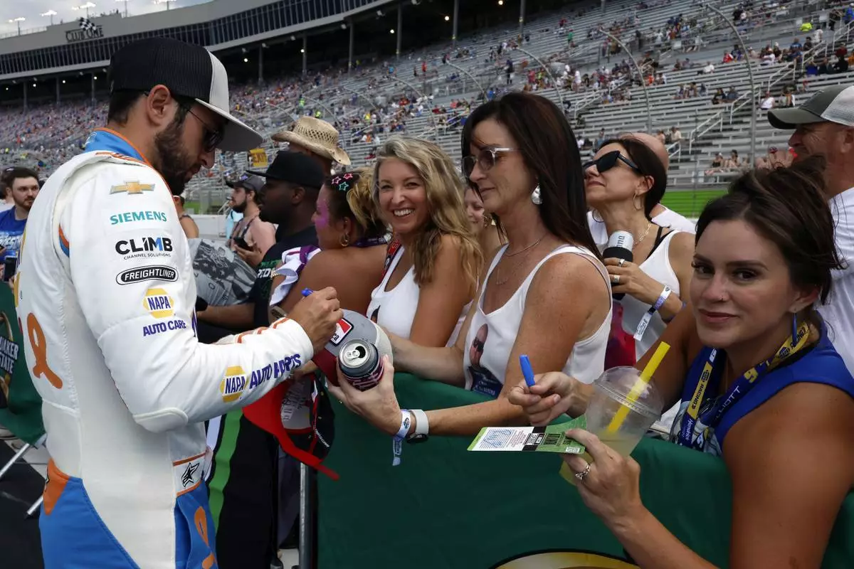 Driver Chase Elliott signs autographs for fans before a NASCAR Cup Series auto race, Saturday, June 28, 2025, in Hampton, Ga. (AP Photo/Butch Dill)