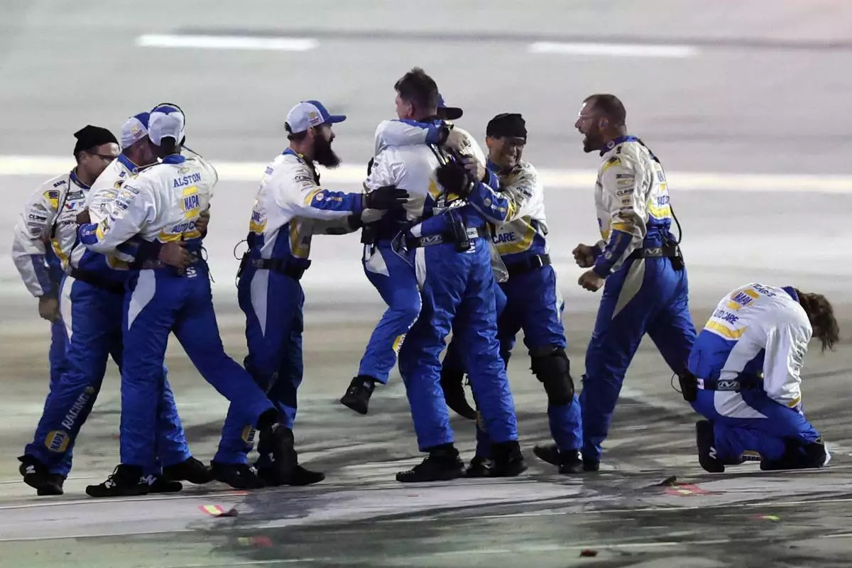Crew members for driver Chase Elliott (9) celebrate after winning a NASCAR Cup Series auto race, Saturday, June 28, 2025, in Hampton, Ga. (AP Photo/Butch Dill)