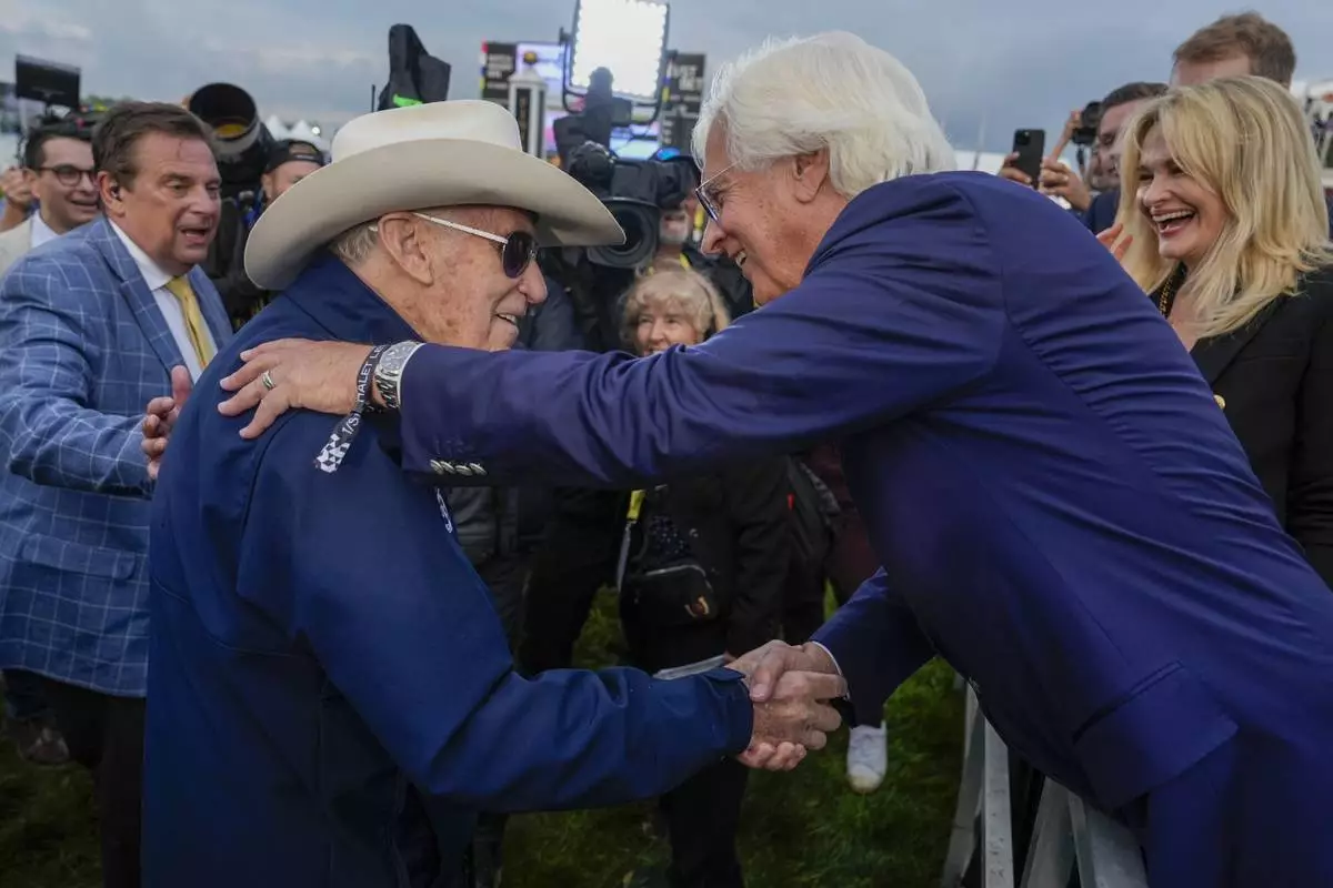 FILE - Seize The Grey's trainer D. Wayne Lukas, left, shakes hands with with Bob Baffert, Imagination's trainer, after Lukas' horse won the Preakness Stakes horse race at Pimlico Race Course, May 18, 2024, in Baltimore. (AP Photo/Julia Nikhinson, file)