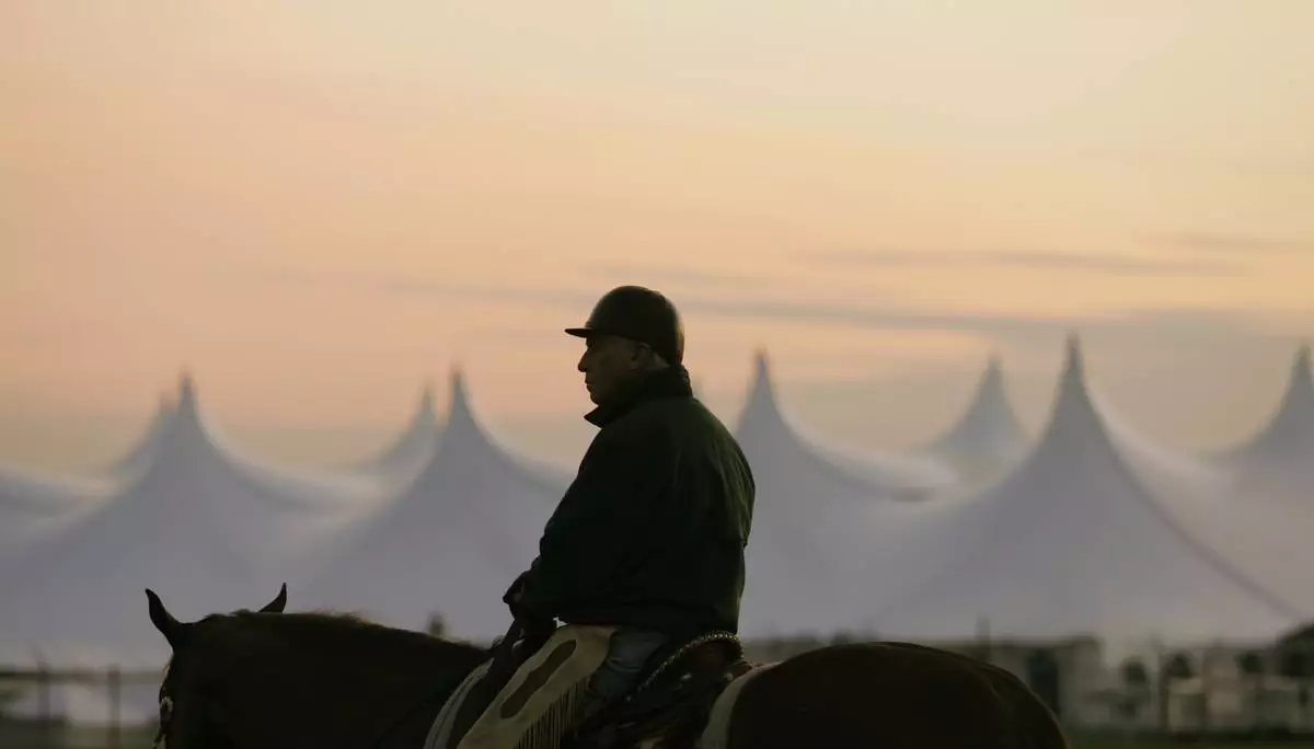 FILE - Trainer D. Wayne Lukas sits atop his horse as he watches morning workouts against the backdrop of a large tent set up in the infield before sunrise at Churchill Downs in Louisville, Ky., April 25, 2009. (AP Photo/Ed Reinke, file)