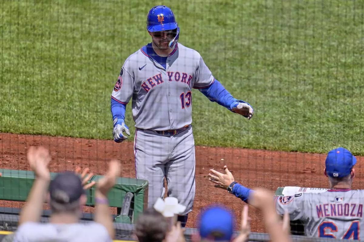 New York Mets' Luis Torrens (13) returns to the dugout after hitting a solo home run off Pittsburgh Pirates pitcher Mike Burrows during the fifth inning of a baseball game in Pittsburgh, Sunday, June 29, 2025. (AP Photo/Gene J. Puskar)