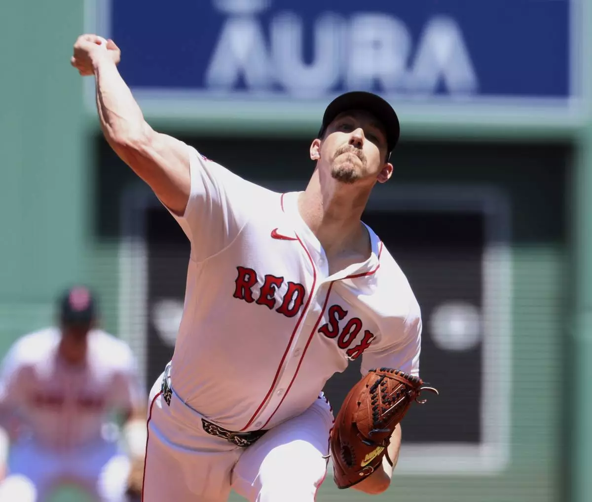 Boston Red Sox pitcher Walker Buehler throws during the first inning of a baseball game against the Toronto Blue Jays, Sunday, June 29, 2025, in Boston. (AP Photo/Mark Stockwell)