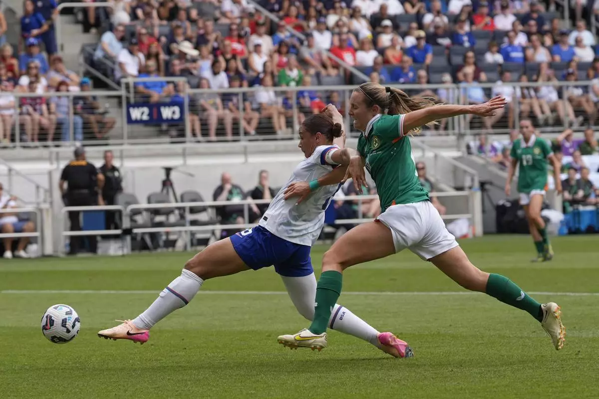 Ireland forward Saoirse Noonan, left, and United States forward Yazmeen Ryan (22) battle for the ball during the first half of an international friendly women's soccer match in Cincinnati, Sunday, June 29, 2025. (AP Photo/Carolyn Kaster)