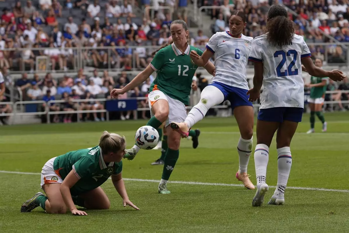 United States forward Lynn Biyendolo (6) kicks the ball past Ireland defenders Jessie Stapleton (2) and Anna Patten (12) as United States forward Yazmeen Ryan (22) moves in during the first half of an international friendly women's soccer match in Cincinnati, Sunday, June 29, 2025. (AP Photo/Carolyn Kaster)
