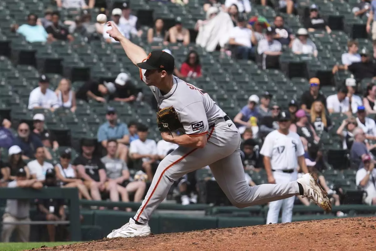 San Francisco Giants relief pitcher Carson Seymour throws against the Chicago White Sox during the eighth inning of a baseball game in Chicago, Sunday, June 29, 2025. (AP Photo/Nam Y. Huh)
