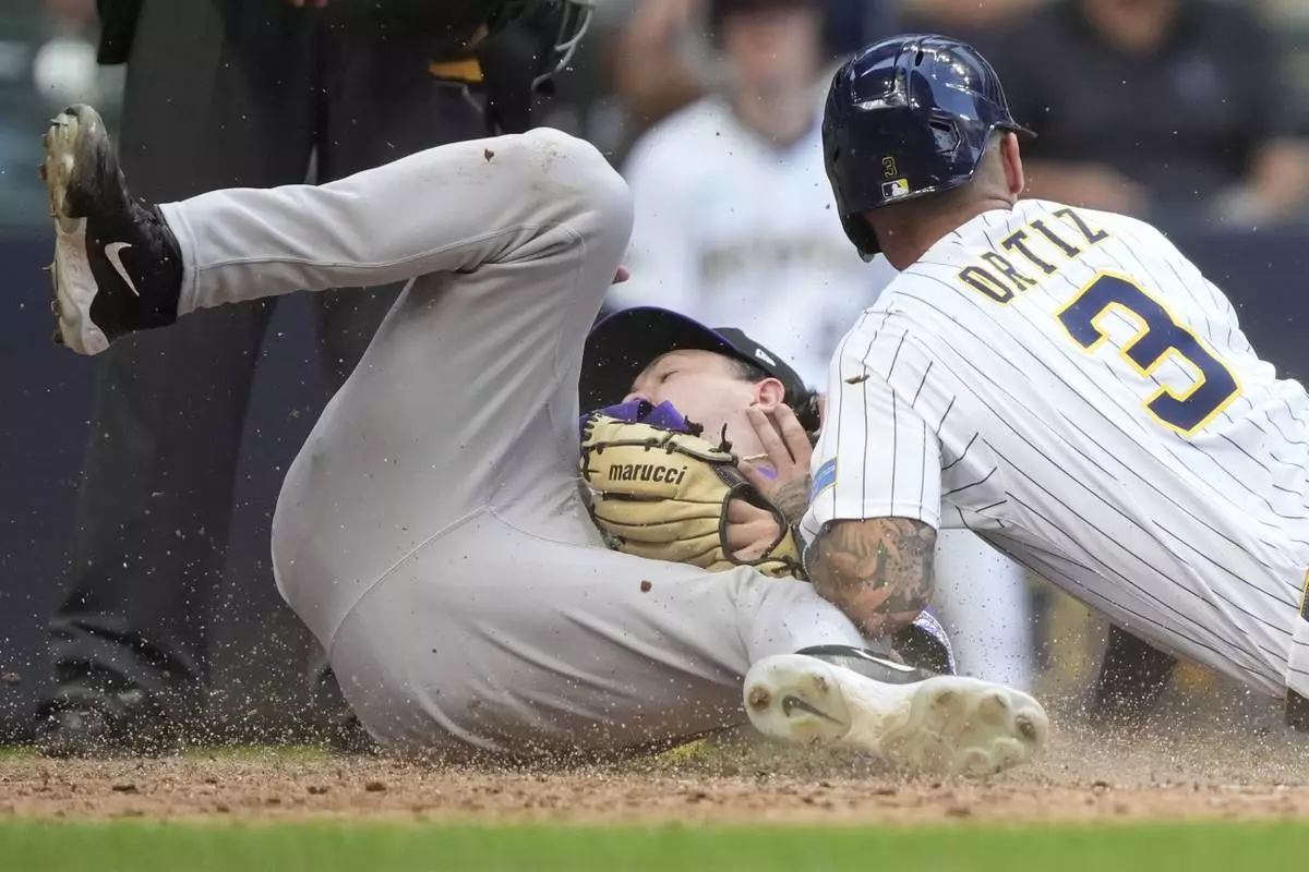 Milwaukee Brewers' Joey Ortiz, bottom, rolls after scoring on a wild pitch during the 10th inning of a baseball game against the Colorado Rockies, Sunday, June 29, 2025, in Milwaukee. (AP Photo/Aaron Gash)