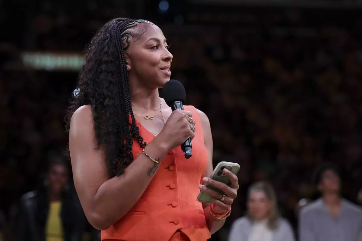 Former Los Angeles Sparks player Candace Parker speaks during her jersey retirement ceremony during a WNBA basketball game between the Sparks and the Chicago Sky, Sunday, June 29, 2025, in Los Angeles. (AP Photo/Jessie Alcheh)