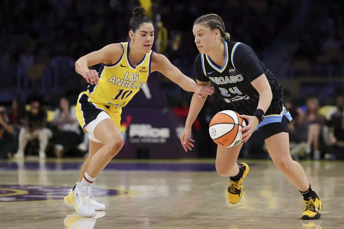 Chicago Sky guard Rachel Banham (24) dribbles against Los Angeles Sparks guard Kelsey Plum (10) during the first half of a WNBA basketball game, Sunday, June 29, 2025, in Los Angeles. (AP Photo/Jessie Alcheh)