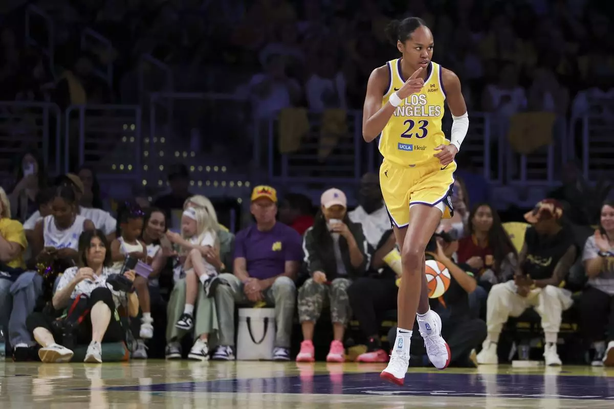 Los Angeles Sparks forward Azura Stevens (23) gestures after scoring against the Chicago Sky during the first half of a WNBA basketball game, Sunday, June 29, 2025, in Los Angeles. (AP Photo/Jessie Alcheh)