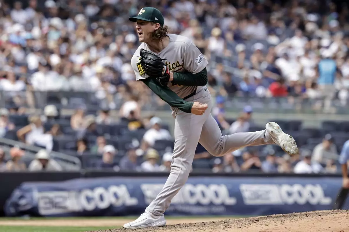 Athletics pitcher Tyler Ferguson throws during the sixth inning of a baseball game against the New York Yankees, Sunday, June 29, 2025, in New York. (AP Photo/Adam Hunger)