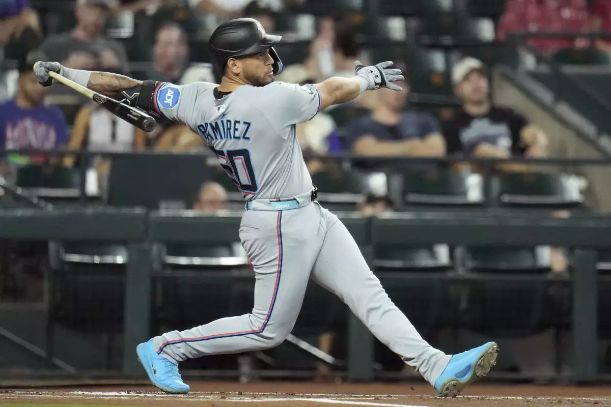 Miami Marlins' Agustín Ramírez connects for a triple against the Arizona Diamondbacks during the first inning of a baseball game Sunday, June 29, 2025, in Phoenix. (AP Photo/Ross D. Franklin)