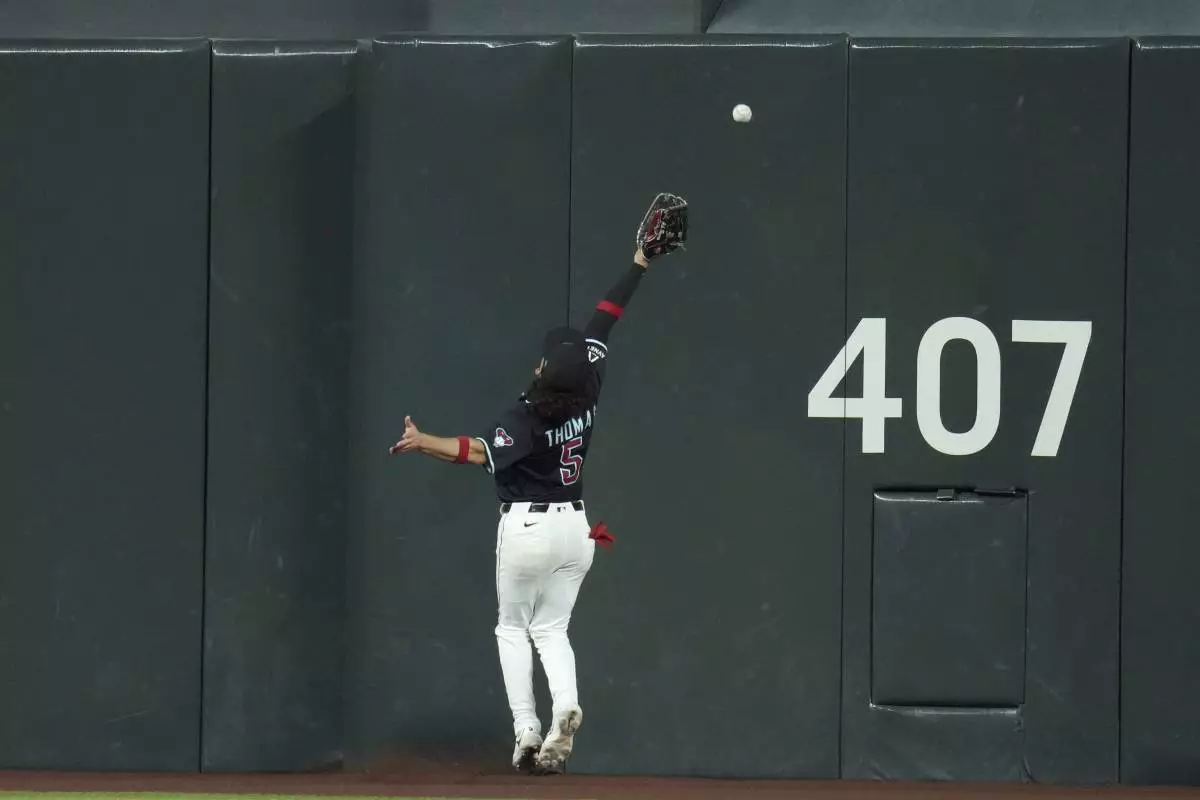 Arizona Diamondbacks center fielder Alek Thomas is unable to make a play on a triple hit by Miami Marlins' Agustín Ramírez during the first inning of a baseball game Sunday, June 29, 2025, in Phoenix. (AP Photo/Ross D. Franklin)