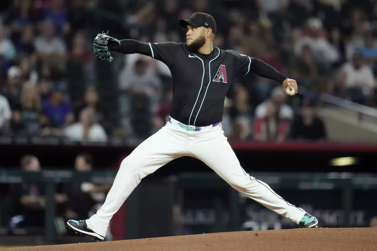 Arizona Diamondbacks starting pitcher Eduardo Rodriguez throws against the Miami Marlins during the first inning of a baseball game Sunday, June 29, 2025, in Phoenix. (AP Photo/Ross D. Franklin)