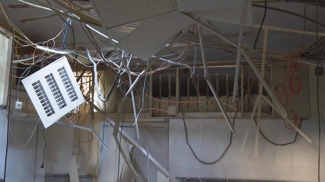 The footage shows severely damaged walls and ceilings, with debris, including shattered glass, scattered across the prison grounds.