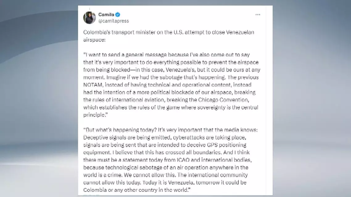 "Deceptive signals are being emitted, cyber attacks are taking place, signals are being sent that are intended to deceive GPS positioning equipment," Rojas said in a post to social media platform X on the U.S. attempt to close the Venezuelan airspace, warning that "this has crossed all boundaries."