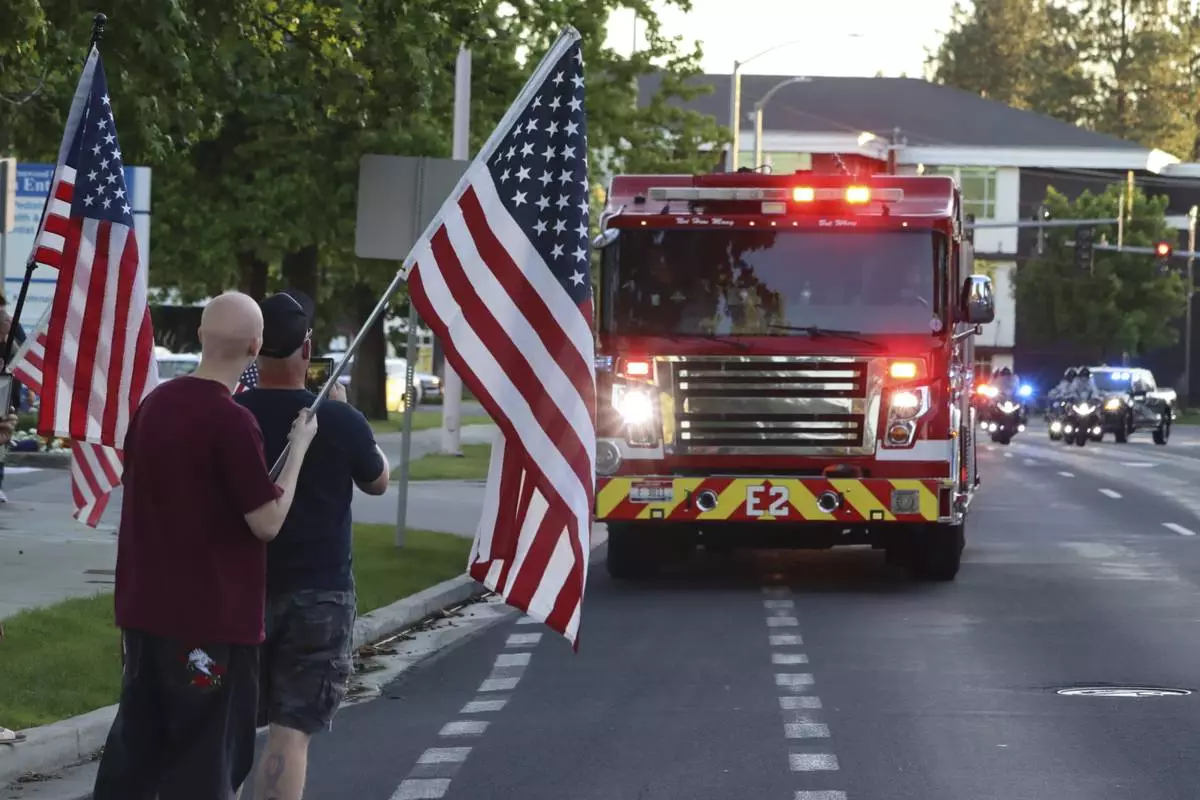 A procession from Kootenai Health headed to Spokane after a few firefighters were killed Sunday, June 29, 2025, when they were ambushed by sniper fire while responding to a blaze in a northern Idaho mountain community, in Coeur d’Alene, Idaho. (Bill Buley/Coeur D'Alene Press via AP)