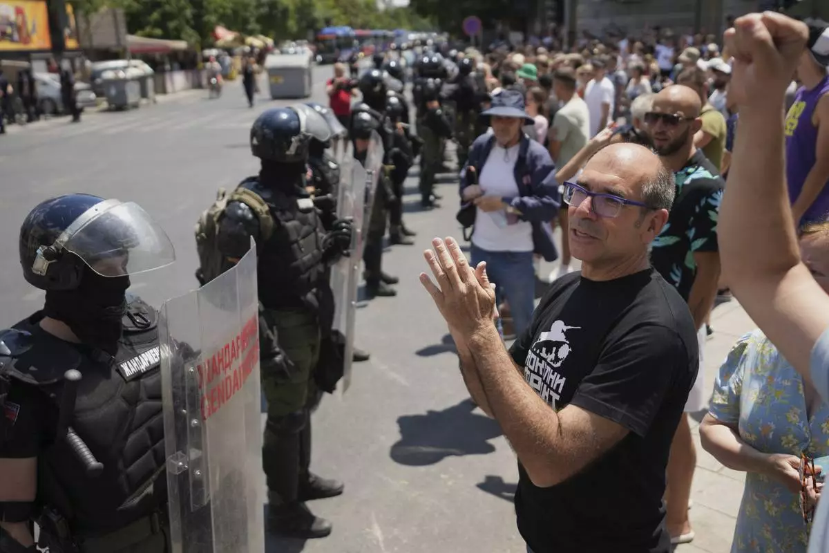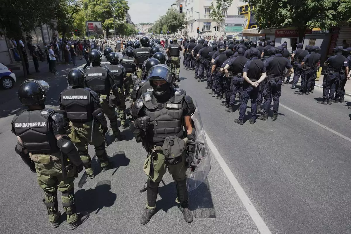 Serbian gendarmerie officers stand in front of anti-government protesters in Belgrade, Serbia, Monday, June 30, 2025. (AP Photo/Darko Vojinovic)