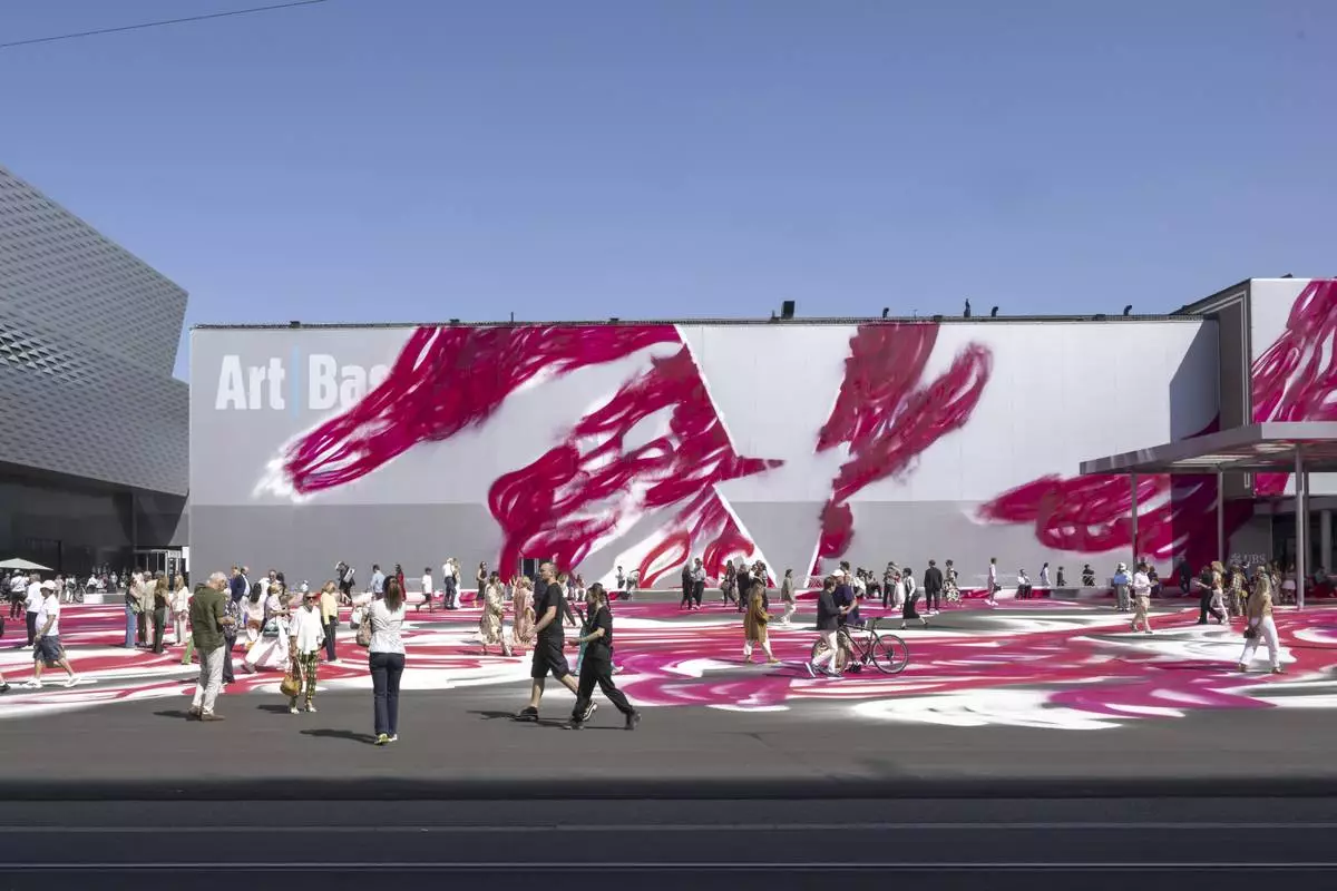The artwork CHOIR (2025) by German artist Katharina Grosse adorns the Messeplatz at the Art Basel 2025, in Basel, Switzerland, Tuesday, June 17, 2025. (Georgios Kefalas/Keystone via AP)