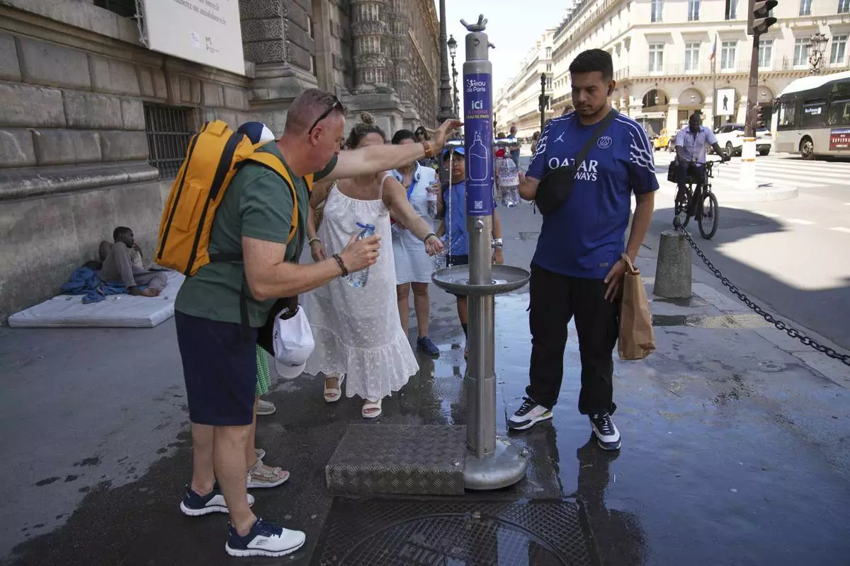 People use a street water fountain during a heat wave, Monday, June 30, 2025 in Paris. (AP Photo/Christophe Ena)
