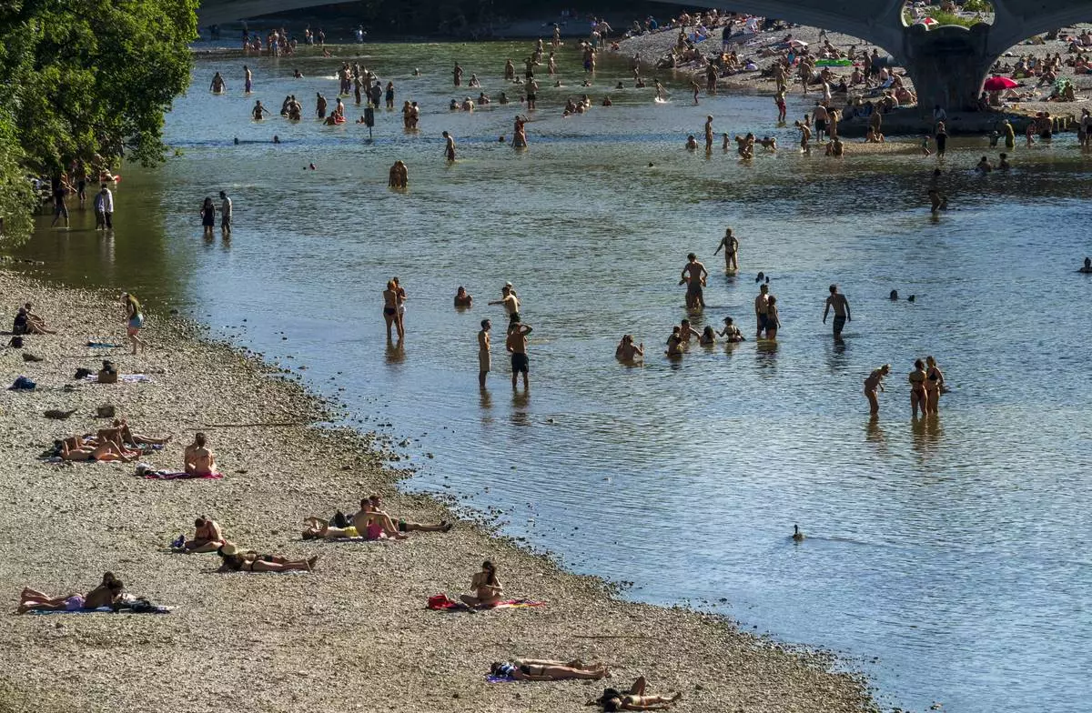 People enjoy the waters of the Isar around the Kabelsteg in Munich, Germany, Sunday June 29, 2025. (Peter Kneffel/dpa via AP)