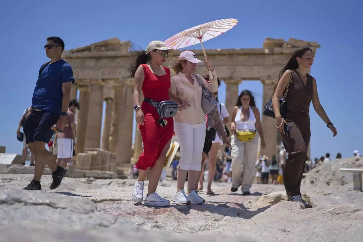 Tourists with an umbrella walk in front of the ancient Parthenon temple at the Acropolis Hill, Thursday, June 26, 2025, as the summer's first heat wave hits Greece, with temperatures expected to edge over 40 degrees Celsius, (104 Farenheit).(AP Photo/Petros Giannakouris)