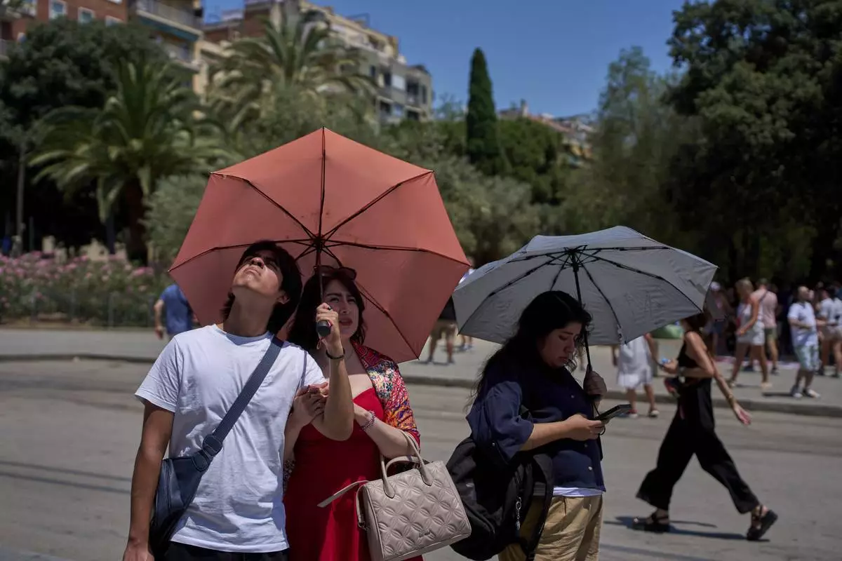 Tourists protect themselves from the sun with umbrellas while looking at the Sagrada Familia church on a hot day in Barcelona, Spain, Monday, June 30, 2025. (AP Photo/Emilio Morenatti)