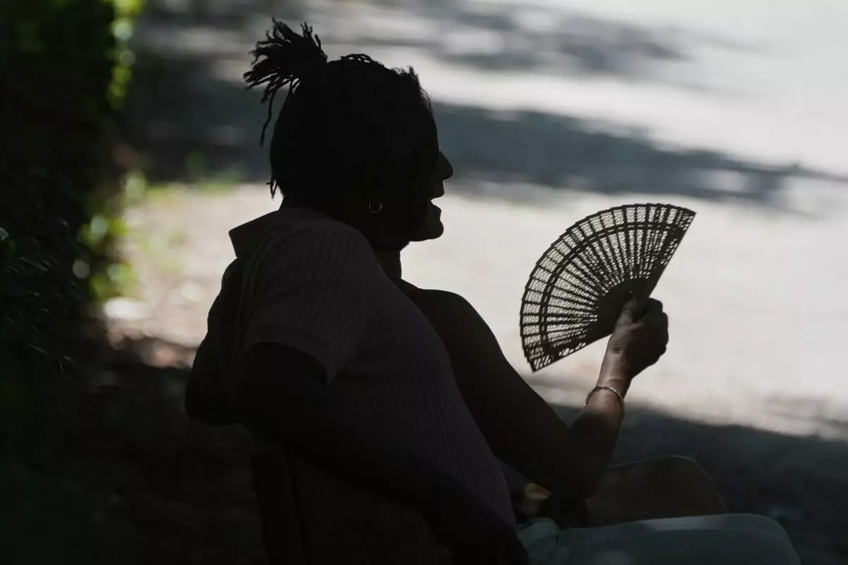 A woman uses a handheld fan in hot weather in Covent Garden, in London, Monday, June 30, 2025. (AP Photo/Alberto Pezzali)
