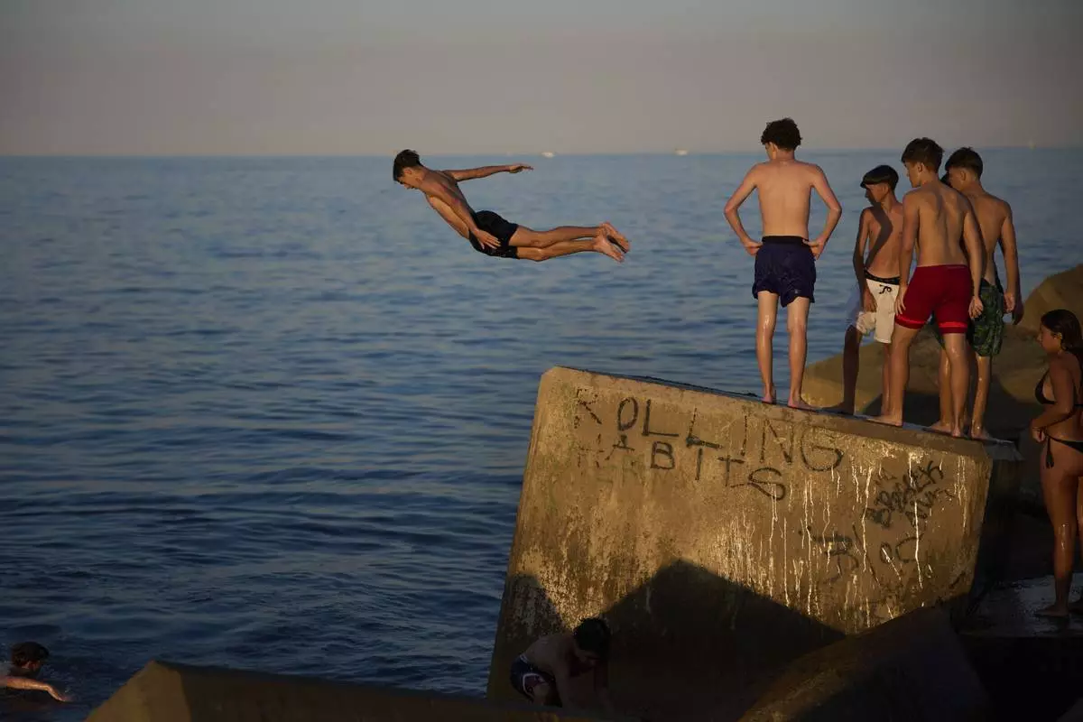 Young swimmers jump into the water from a rock on a breakwater on a hot day in Barcelona, Spain, Sunday, June 29, 2025. (AP Photo/Emilio Morenatti)