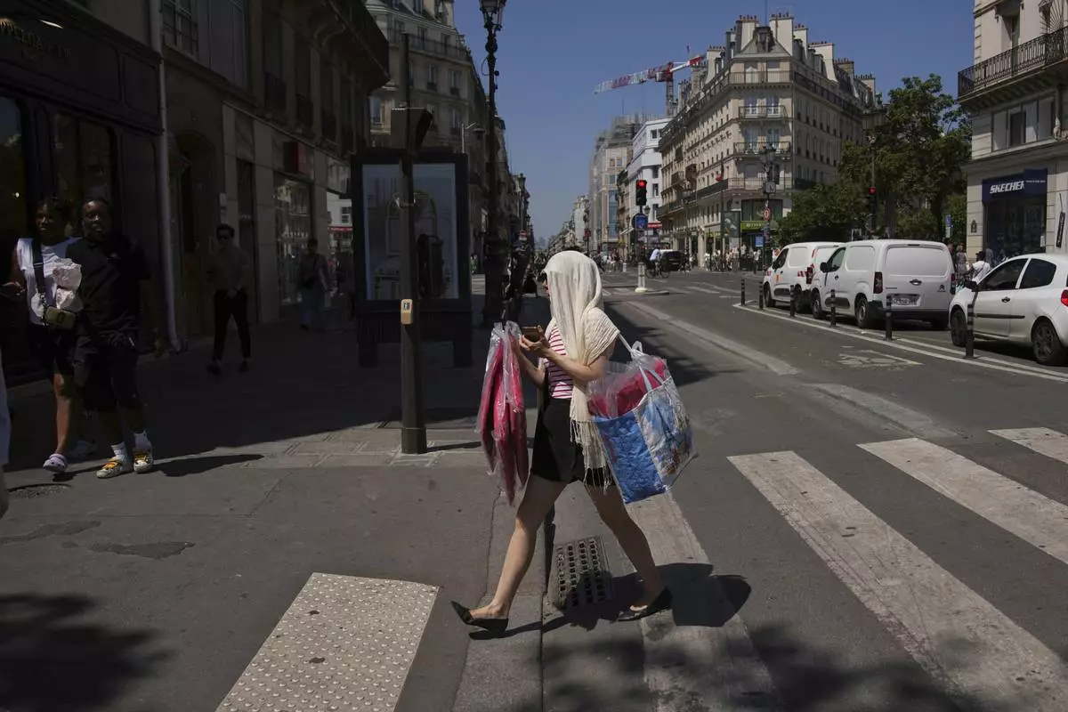 A woman protects her head during a heat wave, Monday, June 30, 2025 in Paris. (AP Photo/Christophe Ena)