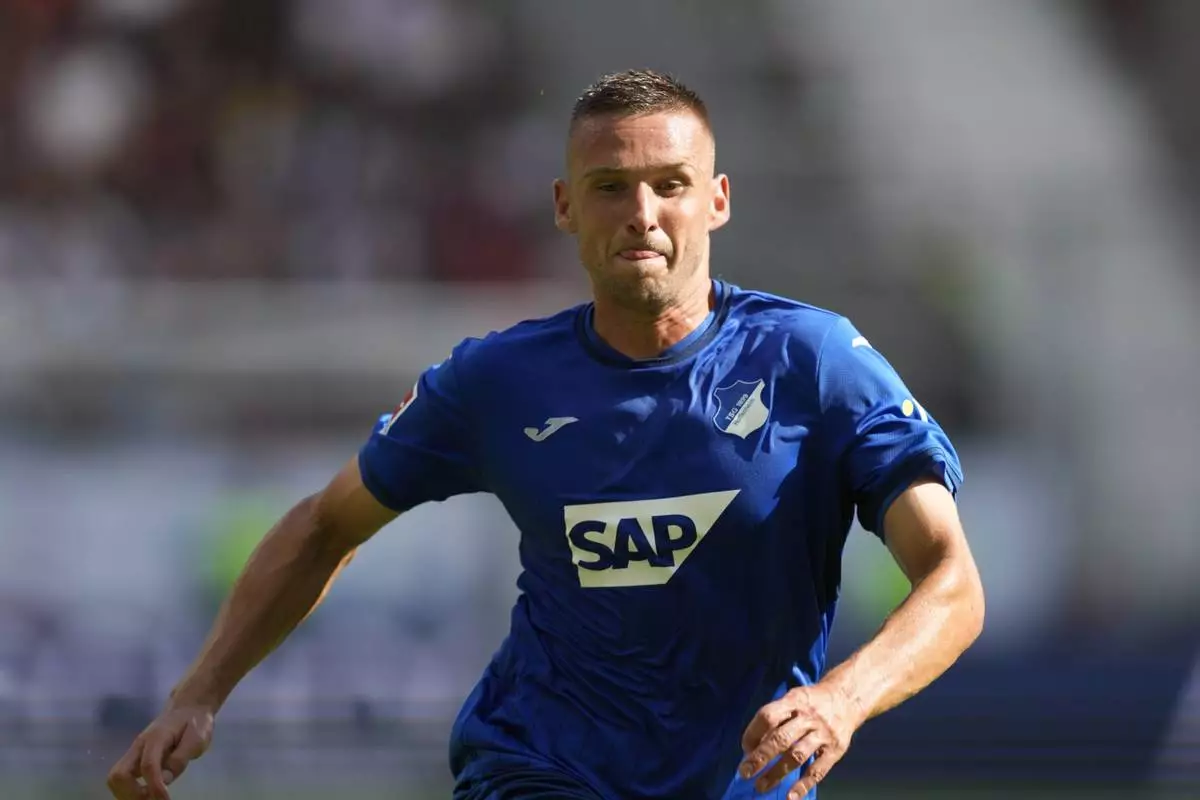 FILE - Hoffenheim's Pavel Kaderabek runs during the German Bundesliga soccer match between Eintracht Frankfurt and TSG 1899 Hoffenheim in Frankfurt, Germany, Aug. 31, 2024. (AP Photo/Michael Probst, File)