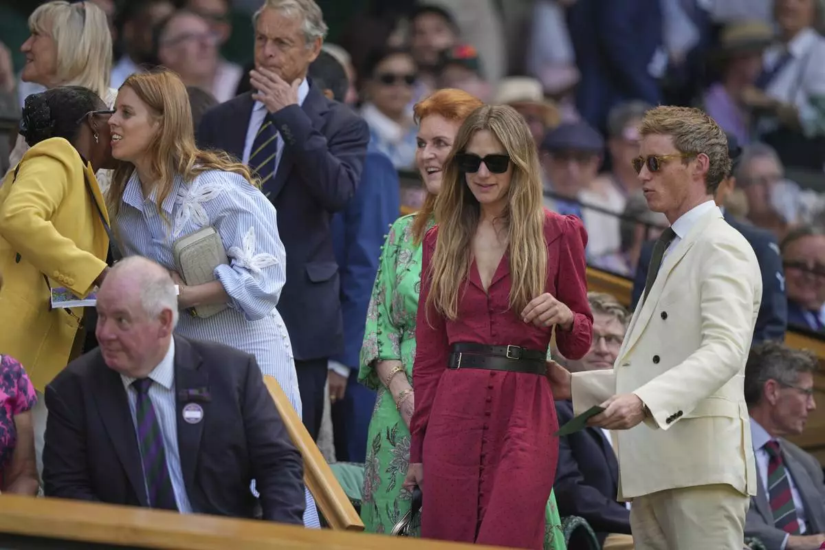 Actor Eddie Redmayne, his wife Hannah, Sarah Ferguson, Duchess of York, and Princess Beatrice, from right, take their seats in the Royal Box on Centre Court on day one at the Wimbledon Tennis Championships in London, Monday, June 30, 2025. (AP Photo/Alastair Grant)
