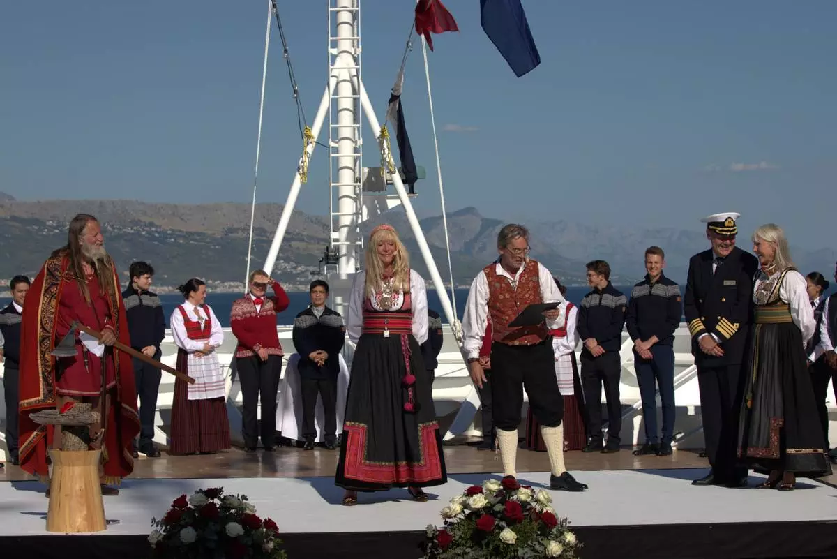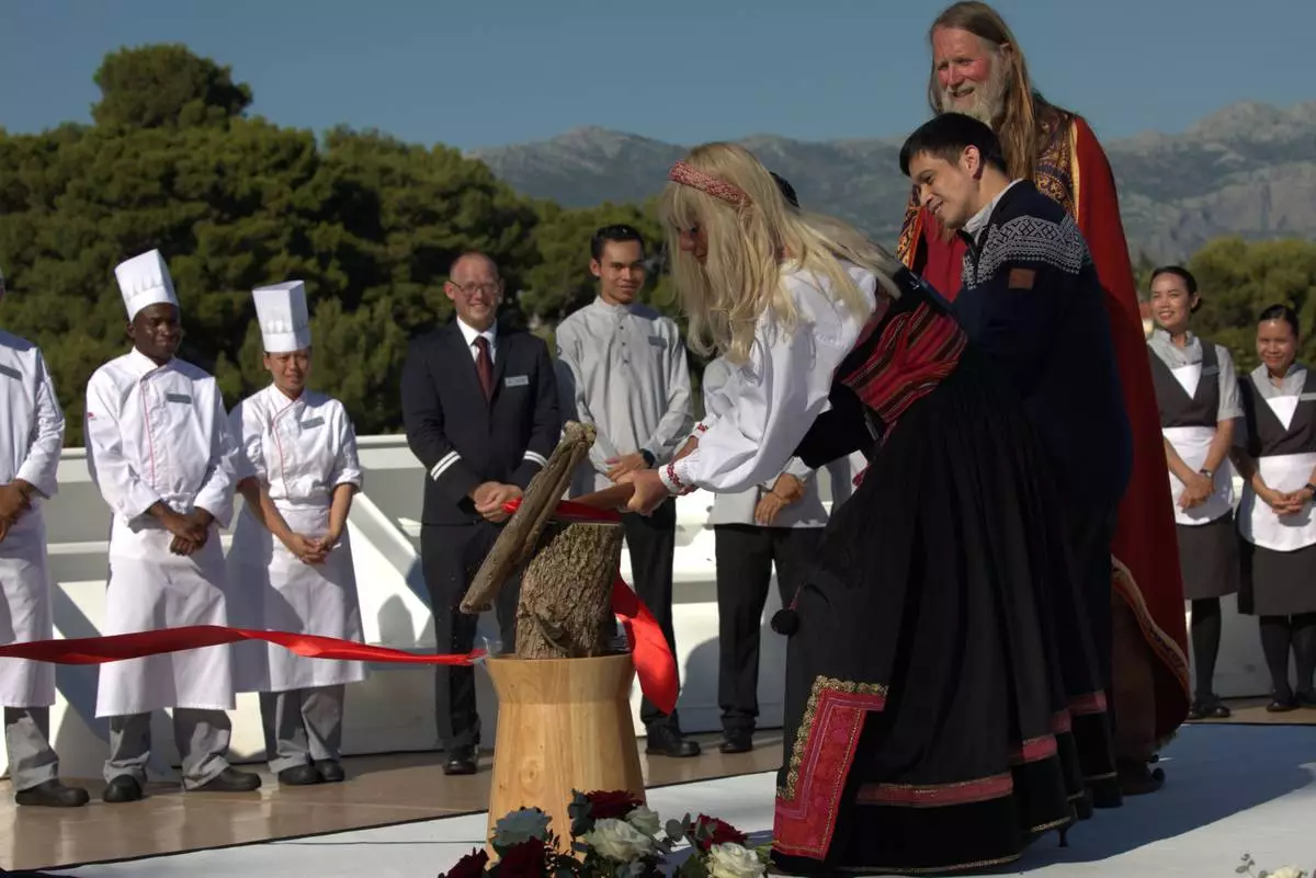 In keeping with the naming tradition, during the ceremony Lene used a Viking broad axe to cut a ribbon that allowed a bottle of Norwegian aquavit to break on the ship’s hull. Guests also enjoyed performances by Sissel Kyrkjebø, one of the world’s leading crossover sopranos and godmother of the Viking Jupiter®, and Norwegian violinist Tor Jaran Apold.