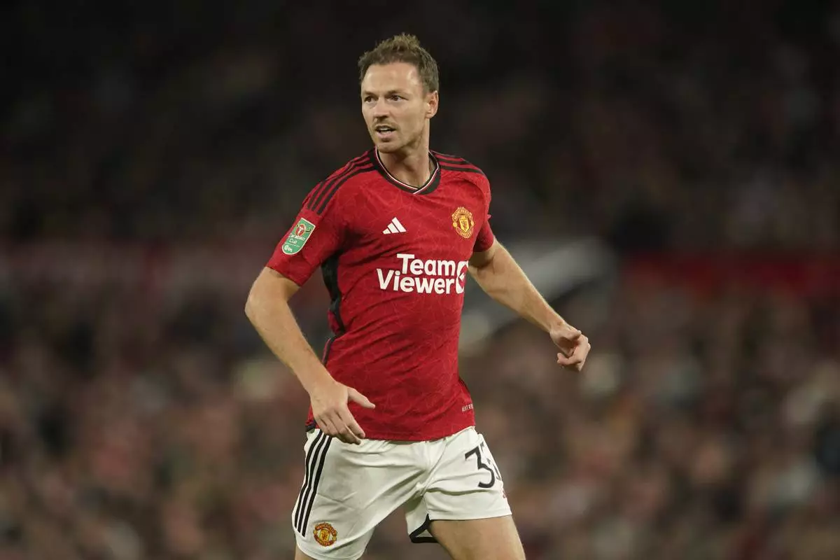 FILE - Manchester United's Jonny Evans runs during the English League Cup third round soccer match against Crystal Palace at Old Trafford stadium in Manchester, England, Sept. 26, 2023. (AP Photo/Dave Thompson, file)