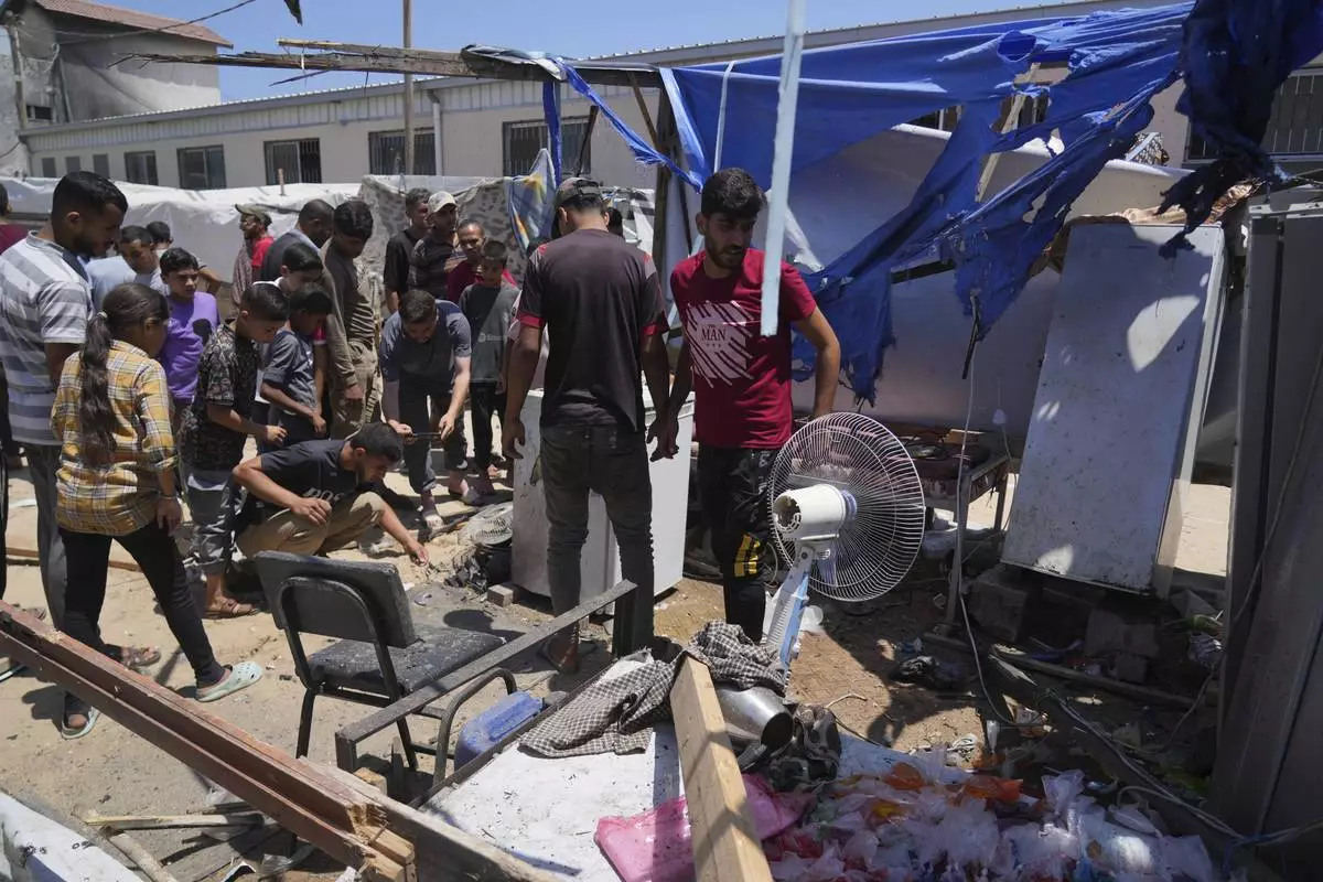 Palestinians check a tent that was damaged after an Israeli strike in the backyard of the Al-Aqsa Hospital in Deir al-Balah, Gaza Strip, Monday, June 30, 2025. (AP Photo/Abdel Kareem Hana)