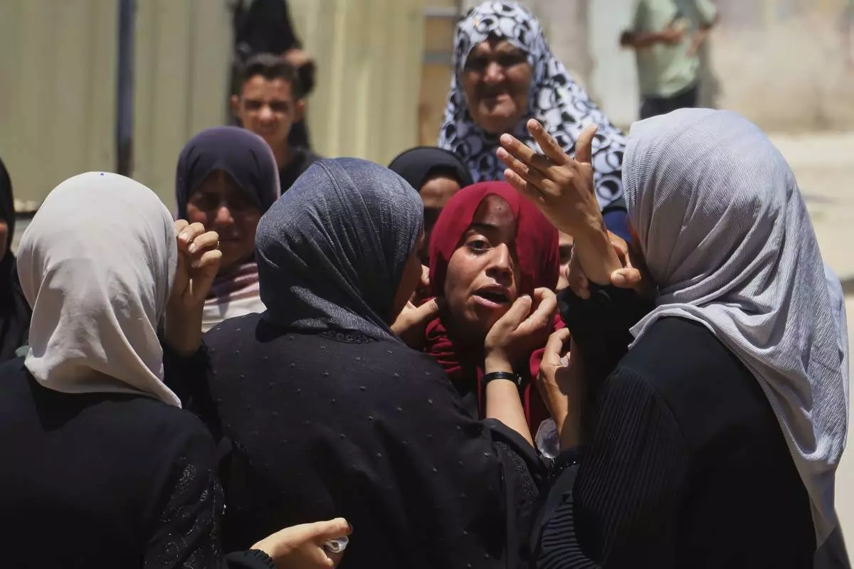Palestinians women mourn during the funeral of people who were killed while returning from one of the Gaza Humanitarian Foundation distribution centers operated by the U.S.-backed organization, according to Nasser Hospital, during their funerals in Khan Younis, Monday, June 30, 2025. (AP Photo/Mariam Dagga)